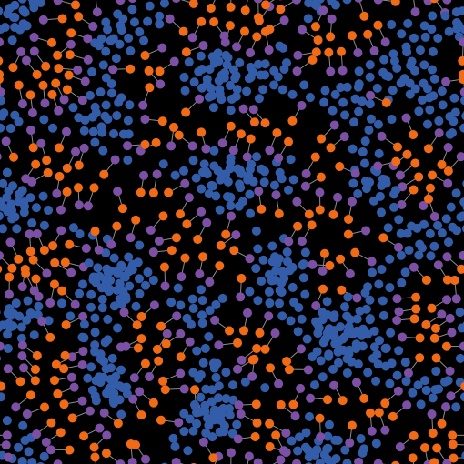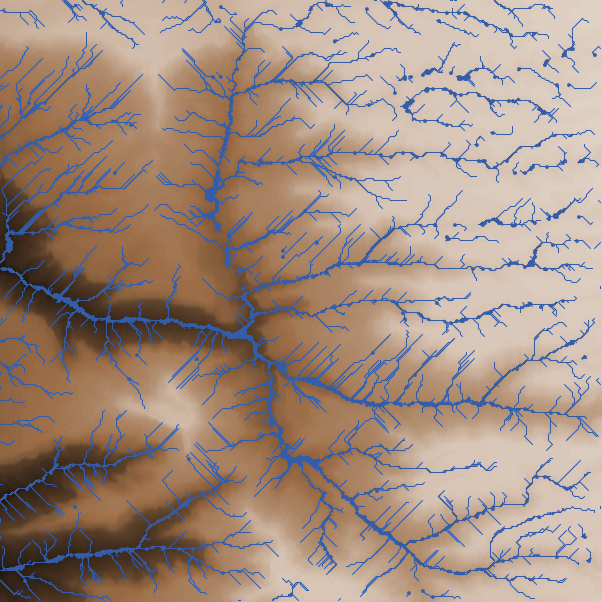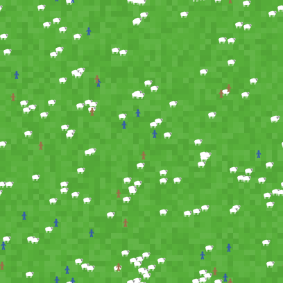 In the model example below, we have a simple environment. Some of our patches are brown, which represents earth, and some are blue, which represents water. We have some bugs in this environment and they need to only move on the brown patches. First, we use the move-to primitive in the setup procedure to make each bug be placed on a random brown patch. Second, we use the move-to primitive (instead of forward) to make sure that our bugs pick a random neighboring brown patch and move to it.